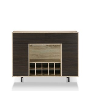 Reorganize your wining and dining essentials with this multi-storage buffet. An open compartment features a 10-bottle wine rack along with a wine glass rack for easy arrangement of your wine collection and glasses. Store bar accessories in the five shelves, and coordinate your casual, modern, contemporary setting with this buffet's natural-and-oak color scheme.