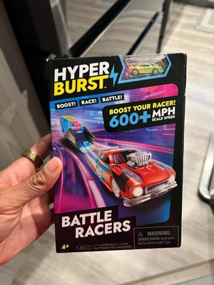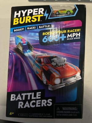 Boost! Race! Battle! Hyper Burst combines traditional vehicle racing play with battle action in a refreshing way! Inspired by the ‘battle royale’ gameplay popularized by video games, Hyper Burst changes the objective from being the fastest to being the last car to survive the track! The cars are Micro Scale - charge up your car and race at over 600+ MPH scale speed! Then battle your way to victory as you knock out your opponent and become the ultimate Hyper Burst champion! The Battle Racers pack includes 1 Launcher and 1 Green Micro Scale Car. Note: requires 2 x AAA batteries (not included).