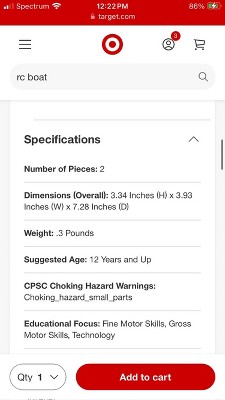 My son was so excited for this RC boat. We knew it would be on the smaller side but what arrived is significantly smaller than the specs listed in the item description. As noted in other reviews it does take a long time to charge, and doesn't hold a charge very long, but it is fast while it is working.
