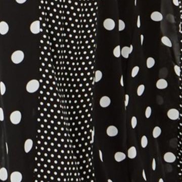 A: The dress features a modern wrap style with a playful polka dot pattern.