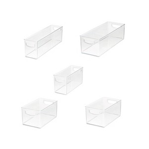 Upgrade your kitchen organization and storage with the iDesign Linus 5-Piece Stackable Kitchen Organizer Bin Set. They're a quick and easy addition to your pantry, cabinet, fridge, or freezer that will bring functional beauty and organized style. The versatile clear organizing bins are ideal for use in the fridge and freezer to store produce, meat, drink boxes, potatoes, and more, or to store dry goods in the pantry. They also make a great snack organizer for pantry. Use the stackable storage drawers to maximize space and easily access or reorganize items with the integrated handles. The transparent design of the clear plastic storage bins ensures items are always visible and accessible. Includes one 10" x 4" x 5" bin, two 10" x 6" x 5" bins, one 16" x 4" x 5" bin, and one 16" x 6" x 5" bin. Use stackable storage bins to store kitchen utensils and tools, cleaning supplies, cosmetics, and crafts, or for extra organization in your closet or laundry room. Made with durable BPA-free clear recycled plastic, the refrigerator organizer bins stand up to everyday use. Easily clean with mild soap and water. With iDesign, you can live simply and sustainably every day.