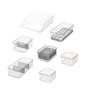Bring home stylized kitchen storage and organization with this iDesign 7-Piece Fridge Organizer Bin Set. With seven clear plastic bins included—one berry bin, one small divided bin, one large divided bin, two small bins, one egg bin, and one bottle bin—this kit makes it easy to upgrade your refrigerator organization. The berry bin features a double-layered design with a removable basket insert to strain the water from your produce, keep moisture to a minimum, and keep berries and other produce fresh. The large food storage bin includes removable dividers that provide up to three sections for storing pre-cut or smaller fruits and veggies, and the small divided bin provides up to two sections of storage. The two small food containers are the ideal size for storing produce as well as single-serve pouches, packets, snacks, and more. All produce saver containers include coordinating lids with integrated notches to keep produce fresh and prevent excess moisture. Plus, the transparent sides make it easy to see what's inside at a glance. The egg bin with lid holds up to 18 eggs in individual sections. The beverage bottle organizer holds up to 9 bottles or larger drink cans with a raised front edge to keep them in place and prevent them from rolling out. These stackable organizers are easy to pair with other bins in iDesign collection (sold separately) for customized storage that fits your unique needs. Made with durable post-consumer, BPA-free recycled plastic, these fridge bins stand up to everyday use and are easily cleaned with soap and water. Handwash only. This set, with some help from iDesign, will help you Make Your Best Home.