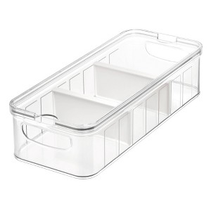 The iDesign Crisp Refrigerator Bin is a versatile addition to your home. This quality bin is made of clear, BPA-free, durable plastic that lasts for years of use. This item is perfect for storing food, craft supplies, cleaning supplies, and more. Use the integrated handles to place items in the fridge, in the freezer, on your countertop, or on a shelf for organization anywhere. With movable dividers, you can customize the size of each section in the bin to suit your needs. The transparent material allows you to easily see your items. Measuring 14.82" x 6.32" x 3.76", this storage bin is useful for any room in your home. With iDesign by InterDesign, you can #LiveSimply every day.