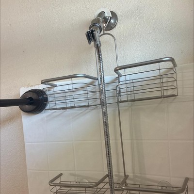 Upgrade your bathroom storage with the iDesign Forma XL Handheld Hose Hanging Shower Caddy. This all-in-one organizer features four storage shelves to keep bathroom necessities such as shampoo and conditioner bottles, shower gel, bar soap, toothbrushes, toothpaste, and more within reach in the shower or bathtub. This innovative shower caddy is designed with space between the shelves to accommodate handheld shower head hoses. The open wire design provides proper airflow and allows items to dry more efficiently after use, while the non-slip grip and integrated suction cup ensure a secure hold in wet or dry conditions. Simply place the organizer over the top of the shower head and push the suction cup into place on the wall to set up - no mounting or hardware required! The durable steel wire construction with satin silver finish stands up to every day use and is easy to clean with mild soap and water. Measuring 23.62" x 16.99" x 4.83", this storage caddy adds instant organization in unused space in the shower. With iDesign by InterDesign, you can #LiveSimply every day.
