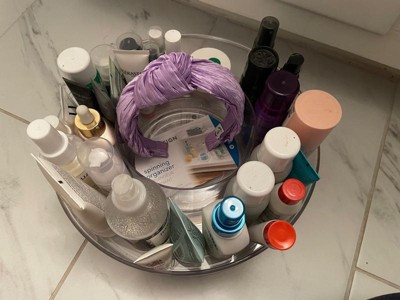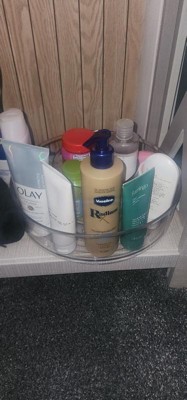 [This review was collected as part of a promotion.] This clear turntable was a welcome addition to my bathroom. I use it to store lotions, makeup and hair products, and love that I can easily spin in around to easily spot what I need. It's pretty sturdy too, so I expect to use it for a very.long time!