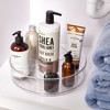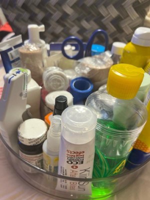 Keep bathroom necessities organized and in reach with the iDesign Linus rotating turntable. This rotating organizer features a roomy storage tray and taller center cup to store and organize shampoo and conditioner bottles, makeup, hair care products, and more at hand on the counter or under the sink. This versatile organizer can also be used in the kitchen, pantry, bedroom, office, or anywhere you need additional organization. Designed with style and function in mind, the open top design with raised sides keeps items easily accessible and prevents them from falling out while turning the organizer. The durable BPA-free clear plastic construction is made to last and is easy to clean with mild soap and water. Measuring 12" x 12" x 3", this rotating lazy Susan is ideal for adding storage in compact spaces. With iDesign by InterDesign, you can #Live Simply every day.