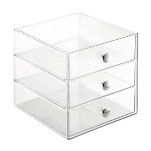 Upgrade your storage with the iDesign 3-Drawer Organizer. This free-standing organizer features three pull-out drawers to store cosmetics, office supplies. The transparent sides ensure contents are always visible and easily accessible, and the convenient knobs make opening and closing the drawers quick and easy. The versatile design can be stacked with additional organizers (sold separately) to maximize storage space, and it can also be used in the office, closet, bedroom, or anywhere in the home that you need additional organization. The durable BPA-free clear plastic construction with polished chrome finish accents stands up to every day use and is easy to clean with mild soap and water. Measuring 6.5" x 6.5" x 6.5", this organizer is ideal for use in compact spaces. With iDesign by InterDesign, you can #LiveSimply every day.