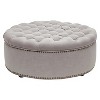 A cut above the rest: the Iglehart Designer Ottoman will exceed your expectations. This beautiful living area centerpiece is made in China with a sturdy eucalyptus wood frame, firm foam cushioning, and beige linen upholstery. Finishing touches include antiqued brass upholstery tacks and black wood legs with non-marking feet. The Iglehart Round Ottoman is fully assembled and should be spot cleaned as needed. This style is also available in dark slate gray (sold separately). 37.4"W x 37.4"D x 15.25"H