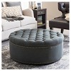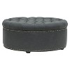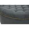 A cut above the rest: the Iglehart Designer Ottoman will exceed your expectations. This beautiful living area centerpiece is made in China with a sturdy eucalyptus wood frame, firm foam cushioning, and dark slate gray linen upholstery. Finishing touches include antiqued brass upholstery tacks and black wood legs with non-marking feet. The Iglehart Round Ottoman is fully assembled and should be spot cleaned as needed. This style is also available in beige (sold separately). 37.4"W x 37.4"D x 15.25"H