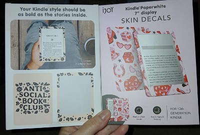 These are fun ereader decals. They fit well and have stayed on so far. I like dressing up my devices to make them stand out.
