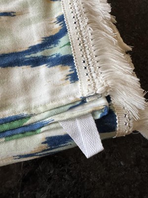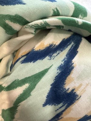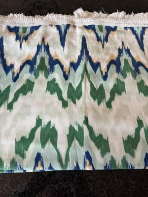 • Features an ikat print in blue, green and tan hues