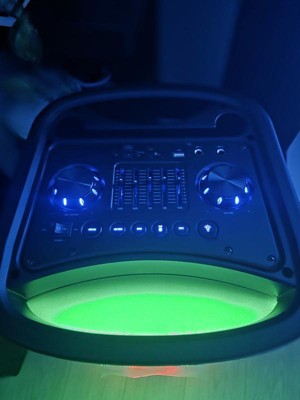 [This review was collected as part of a promotion.] Got this as a Christmas gift. So Far works as advertised. Fun lights and enjoy having the mic for karaoke. Lightweight and easy to move around with the wheels