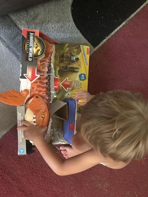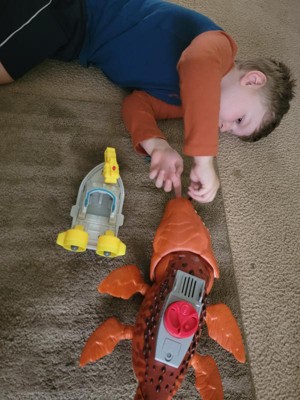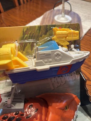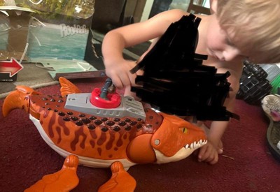 - The 18-inch-long dinosaur toy features sound and movement and includes an action figure with patrol boat and launcher for active storytelling!