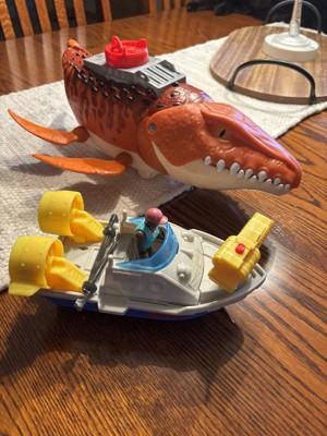 [This review was collected as part of a promotion.] Jurassic world Mosasaurus, with noise and mouth opens.. including a boat with shooter and a man figure. My 5 year old nephew played with this for a long time when first opened. Having the mosasaur screech and the manned boat he said is “awesome”
