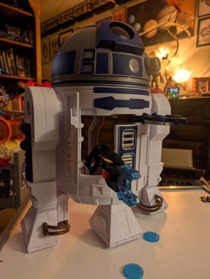 [This review was collected as part of a promotion.] The kids love Star Wars and R2-D2. So, they were super excited to play with R2-D2. R2-D2 does require some assembly. It is pretty straight forward. Just need to attach R2-D2's feet. There are two plastic coins and C3-PO key figure which was surprising heavy duty and feels like it is metal casted. R2-D2 itself is mostly hard plastic. R2-D2 has some fun features. You can roll R2-D2 around as it has wheels. If you turn the C3-PO, R2-D2 saw tool and claw hand will pop out. The claw hand can shot the plastic coins. R2-D2 also talks and has volumn contro (off, low, high). Back of R2-D2 is open. So, you can see how things move. There is two slots for the plastic coins. The C3-PO key figure can fall off easily. Even though you can roll R2-D2 arounds it is not that smooth and can tip. Overall this is a fun and interactive. The kids has a new buddy to hang out with.