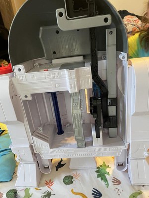 - Hands-on play: roll the droid along on wheels, send projectiles flying from the launcher, spin the pretend blade, and lift the elevator on the back to raise periscope