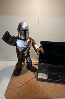 [This review was collected as part of a promotion.] When I opened the box I was surprised at just how big this toy was! This Mandalorian was a gift for my son. In a house of girls, he has fun running after his sisters collection of barbies and 18 inch dolls with this and saving them from "danger" and the force. The little shooter it comes with goes further than I expected and is a lot of fun too! I do wish it had a few more features or mayne made some sound effects but the point of this toy is to use your imagination after all! My son still enjoys making his own crashing and missile sounds anyway. Also, due to the size and quality of this figure, it makes a really great decor piece for Star Wars and Mandalorian fans! My one critique or wish for this toy would be extra projectile pieces. It only comes with one dart and its pretty small so I'm worried it won't be long before its lost. Since that is this toy's only extra feature, that will be a big bummer when/if that day comes. Pictured with some barbie friends and a full size laptop for scale.
