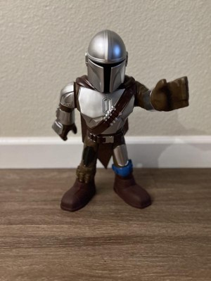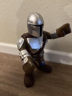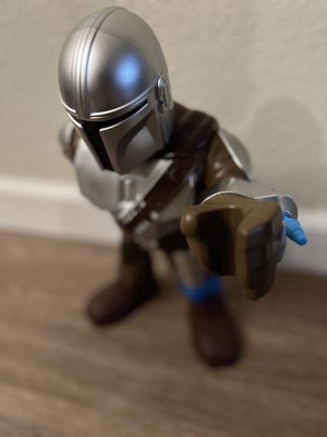 [This review was collected as part of a promotion.] The Mandalorian XXL is a great toy for those with vast imaginations. He stands about 16 inches tall. He shoots a blaster from his arm. His arms can move over his head. He can also go into a sitting position. We were bummed to find out that you can't really make him walk so you'll have to waddle him or fly him to his destination. My child's attention was limited with The Mandalorian and quickly moved on to something else. He may turn into a decorative item for my child's room (or mine).