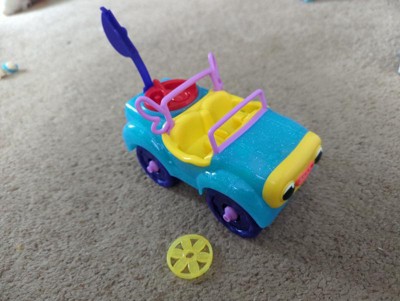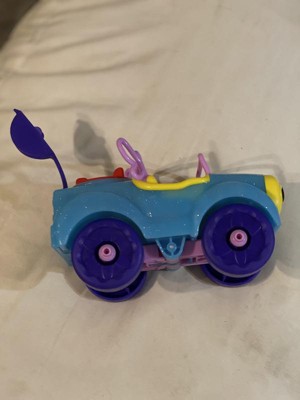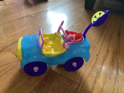 [This review was collected as part of a promotion.] This is a super cute car with lots of features! Twisting the red circle, which a troll can click into, pops the car up to be taller. It easily returns to lower with a gentle push down. The flower disks are easy to launch, even for small hands, and the disks click into the wheels for storage. My only complaint is that it only comes with 2 flower discs. They launch pretty far and are easily lost, so it would have been nice if more were includes.