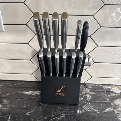 [Premium Designed Knife Set]: This kitchen knife set is made of high carbon stainless steel, which is resistance to rust, corrosion and discoloration. The special lightning stripes design not only for good looking, but also for non-slip. [Unique Ergonomic Design]: One-piece Full-Tang stainless steel handle for the sharpness, stability and balance on precise cutting. Avoid hiding filth or even cracking. The ergonomic design is easy to hold and balanced in your hand, ensures comfort and safety. [Value Knife Set]: The 14-piece knife set with block includes: 8" chef knife, 8" bread knife, 8" slicing knife, 7" santoku knife, 5" utility knife, 3.5" paring knife, 4.5" serrated steak knife set of 6, kitchen shears and a knife block which made of natural wood with finely black coating. [Easy Care & Store]: The Kitchen knife set is well organized in wood block, tidy and space-saving. Dishwasher Safe, but hand wash is better for longer sharpness and lifespan! Please wipe them dry in time after cleaning & place in dry, ventilated place. [Service]: imarku knife set comes with a beautiful and elegant gift box. Perfect gift for Housewarming, Wedding, Birthday, Thanksgiving, Christmas, Anniversary etc. Provide quality warranty, contact 24/7 support service online if you have any questions with your purchase.