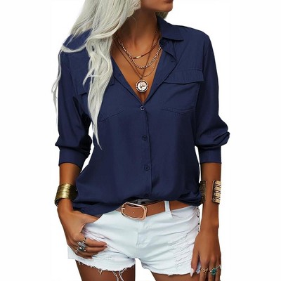 Imily Bela Womens 3/4 Bell Sleeve Eyelet Button Down Shirt Casual Ruffle Hem Blouse Navy Blue L