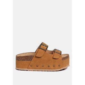 Are you even living in the 21st century modern era if you don't own a pair of these slip ons? Stylish, versatile, and a rad aesthetic with the cork detail and double pin buckle vamp, the pair is also comfortable with the flat platforms. The slip on design gives them an easy to wear experience, perfect for daily wear. A personal styling tip? Pair them with your favorite socks for a trendy chic look! Type: Slip Ons Upper Material: Faux Leather Outer Sole: TPR Open Round Toe Flat Platforms Slip On Design Double Pin Buckle Straps Vamp Stud Embellishments Soft Cushion Insoles Heel Height: 1.5 inches SH5374