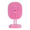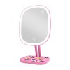 Impressions Vanity introducing Hello Kitty and Friends Core artwork mirror is sophisticated and elegant. Makeup Vanity mirror stands on a double post support connected to a base. The base is pink and decorated with various cartoon characters. The characters resemble stylized animals or fantasy creatures, giving the mirror a fun, youthful vibe. A light vanity mirror adds a delightfully elegant a playful twist to your beauty space. An integrated LED light strip lines the inner edge of the mirror, with a circular touch button at the bottom center for easy lighting control