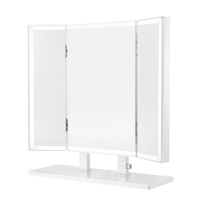 Glamour, warmth, and luxury — the trifecta ambience obtained with the all new Trifecta PLUS Vanity Mirror. Bordered by a high-quality LED light strip or 15 LED globe bulbs, providing dimmable ultra-bright studio lighting. This trifold vanity mirror adds a touch of elevated radiance to any glam room. (Powered by US standard plug-in cord.)