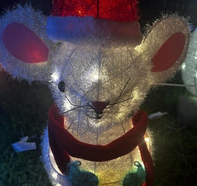 Add some whimsy to your holiday setup with this Incandescent Tinsel Mouse Christmas Novelty Sculpture from Wondershop™. The decorative figurine showcases a white tinsel mouse wearing a red Santa hat, matching scarf and boots and green gloves and holding a Christmas tree with a star tree topper. Plus, it's fitted with 55 incandescent clear and multicolor light bulbs for a burst of festive sparkle.