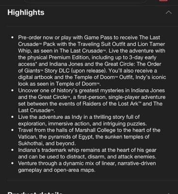 Live the adventure with the Premium Edition, including Indiana Jones and the Great Circle: The Order of Giants™ Story DLC (upon release). You’ll also receive a digital artbook and the Temple of Doom™ Outfit, Indy’s iconic look as seen in Temple of Doom™. Uncover one of history’s greatest mysteries in Indiana Jones and the Great Circle™, a first-person, single-player adventure set between the events of Raiders of the Lost Ark™ and The Last Crusade™. The year is 1937, sinister forces are scouring the globe for the secret to an ancient power connected to the Great Circle, and only one person can stop them – Indiana Jones™. You’ll become the legendary archaeologist in this cinematic action-adventure game from MachineGames, the award-winning studio behind the recent Wolfenstein series, and executive produced by Hall of Fame game designer Todd Howard.