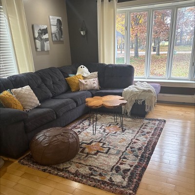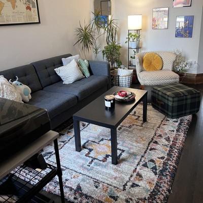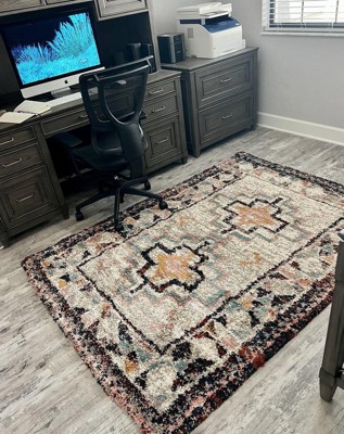 A: The rug features a weathered geometric pattern in a variety of hues, offering a boho-chic appeal.