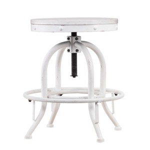 Where farmhouse and industrial style meld, you'll find this adjustable height stool. Whitewashed, shiplap-esque planked seat and antiqued white metal combine for a rustic take on a classic silhouette. Convenient convertibility takes this stool from c"asual anywhere seating to counter height in a snap. Nail a rugged, countrified look with this adaptable stool pulled up to a kitchen island, game table, or vanity. Distressing, whitewashing, and wood grain will vary. "