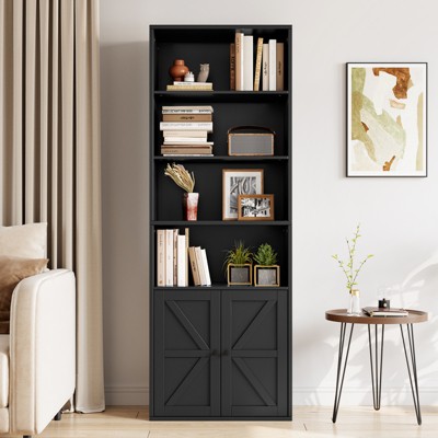 Industrial Black Bookcase with Doors, 5-Shelf Storage, 11.8in Depth, 71.4in Tall, for Bedroom/Living Room/Office