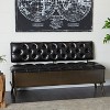 - •Upholstered faux leather bench features tufted faux leather back and seat that lifts up to reveal additional storage, and supported by tapered style legs for an elevated under clearance space