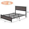 XBT rivet industrial bed frame combines metal frame with MDF panels, featuring 1 USB & 1 Type-C charging ports on headboard. 9 legs & 12 steel slats provide sturdy support (no box spring needed). Noise-reducing design with wood-grain headboard/footboard. Easy assembly with instructions.