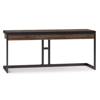 Keep your work table space organize and chic with this spacious work desk. Ideal for office work and school with slender look for compact friendly spaces. Ideal complement to vanilla and pastel-painted walls. This item ships in 2 cartons. Suitable for indoor use only. This item ships fully assembled in one piece. Due to the live edges of the piece, each is unique, so no two products will have an identical pattern, shade, or cut. Maximum weight limit is 100 lbs. Made in India. This is a single brown colored vanity desk. Industrial style.