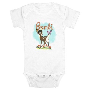- The smallest family members are also the most stylish with this new Bodysuit that is perfect for crawling around and indoor play! Featuring Bambi mesmerized by a butterfly along with the movie title name in script brown lettering across the front.