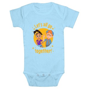 Let your curiosity run wild with Blippi! Join Blippi and his friends as they explore real-life places and learn through play with adorable new officially licensed apparel for your baby from Blippi! This Go Together bodysuit features an animated version of Meekah and Blippi smiling in front of a yellow circle and the text: "Let's All Go Together" in yellow lettering across the front. Get your Blippi gear today and get in all the fun!