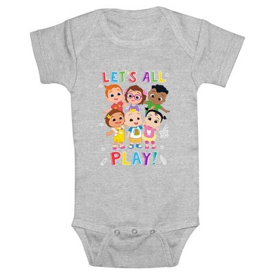 Join parents and kids alike for 3D-animated traditional nursery songs and original children's songs with officially licensed apparel for your baby from the popular YouTube channel Cocomelon! This Playing With Friends bodysuit features some of your favorite characters like JJ, Nico, Bella, Nina, Cody, and Cece along with the phrase: "Let's All Play!" in colorful lettering across the front. Grab some new Cocomelon bodysuits today and sing along to all your favorite songs in style!