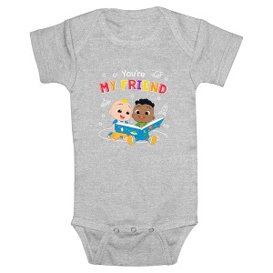 Join parents and kids alike for 3D-animated traditional nursery songs and original children's songs with officially licensed apparel for the your baby from the popular YouTube channel Cocomelon! This You're My Friend bodysuit reads "You're My Friend" with colorful lettering above a cute graphic of Cody and JJ having fun reading a book about space. Grab some new Cocomelon bodysuits today and sing along to all your favorite songs in style!
