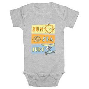 - Even the smallest family members can now get in on the magic of Disney with these new infant bodysuits that are perfect for crawling around and indoor play! Featuringa happy sun, waves, Micky, and the words "Sun, Sea, Surf" in colorful panels.