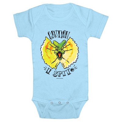 - The smallest family members are also the most stylish with this new Bodysuit that is perfect for crawling around and indoor play! Featuring a Dilophosaurus getting ready to spit acid with the phrase: "Caution I Spit" across the front. Life finds a way… especially when it comes to getting your hands on this Jurassic World bodysuit.