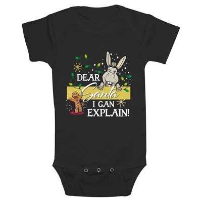 - The smallest family members are also the most stylish with this new Bodysuit that is perfect for crawling around and indoor play! Featuring a graphic of Gingerbread Man aka Gingy and Donkey smiling with Christmas lights around them and the phrase "Dear Santa I Can Explain".