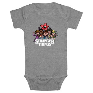 - The smallest family members are also the most stylish with this new Bodysuit that is perfect for crawling around and indoor play! Featuring adorable cartoon versions of Eleven, Mike, Will, Dustin, Lucas, and The Demogorgon, along with the classic Stranger Things logo printed below them.