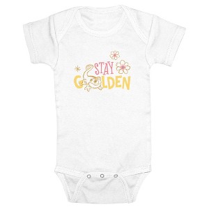 Rapunzel and her gang of thugs from The Snuggly Duckling have a dream and it's getting their hands on this awesome officially licensed Infant Disney Tangled Pascal Stay Golden Graphic Bodysuit! Get tangled up with a fun bodysuit featuring a cute lined version of Pascal along with yellow flowers and the phrase: "Stay Golden" in pink and yellow lettering across the front. Newborns will love this classic fashion that shows off their favorite characters and is perfect for Tangled fans of all ages!