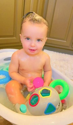 [This review was collected as part of a promotion.] This whale is cute and fun for bath time and the little shapes make it a challenge. My baby seems to really like it but I don't know that it's something I would normally purchase because it's kind of large for a bath time toy