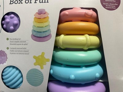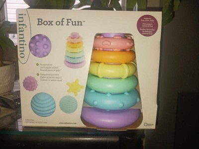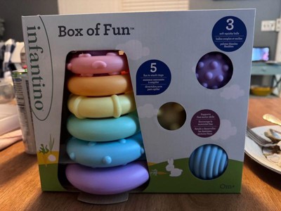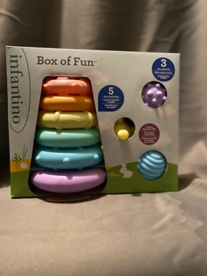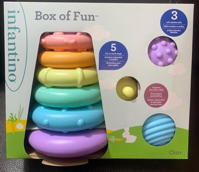 [This review was collected as part of a promotion.] The Infantino Box of Fun Stacker and Ball Set is a huge hit in our house! The stackable rings and colorful balls keep my toddler entertained for hours, encouraging creativity and fine motor skills. The pieces are lightweight and easy for little hands to hold, and the durable design holds up to all the tossing and stacking.