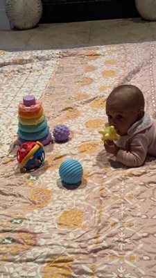 [This review was collected as part of a promotion.] This baby toy set has lovely pastel colors and a variety of textures that make it visually appealing. My 4-month-old especially loves the squishy balls - she enjoys watching them roll and using them for teething. However, the stacker isn’t a hit yet, as the rings are too big for her little hands. I also own a similar stacker from another brand, and this one feels cheaper in comparison. Still, a decent set for sensory play!