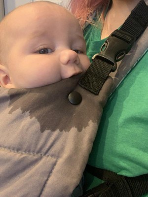 I have received this item from Infantino to facilitate my review. I received this carrier just after my daughter was born three months ago. She just started to fit comfortably in about a month ago, around 13 lbs. Comfortably meaning fitting the panel knee to knee. I did put her in, without complaint from her, before this to do quick chores around the house. I love using these carriers from Infantino when my babies are small as they fit smaller babies faster and without extra inserts. This carrier is easy to use, adorable, and snuggly. It has a nice hoodie like pocket to keep your hands warm on fall walks. The hood has a stiff rim to keep it up and out of your baby's face. I have been comfortable wearing this while doing chores around our hobby farm and in the house for hours. My little one seems comfortable and doesn't fuss when worn in it.