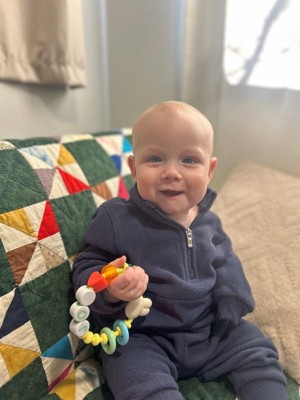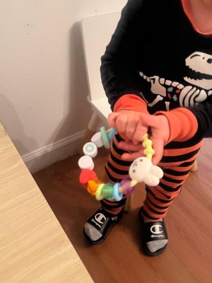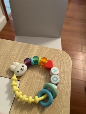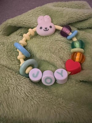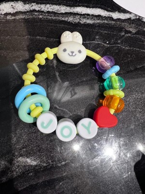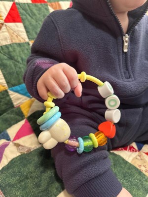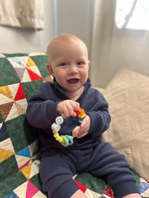 [This review was collected as part of a promotion.] Super cute and easy for my baby to carry. Love the look of a big bracelet since he tried to take his sisters things all the time. It’s soft enough to be comfortable for him to hold onto and feels very durable. He throws it and it doesn’t budge or break.